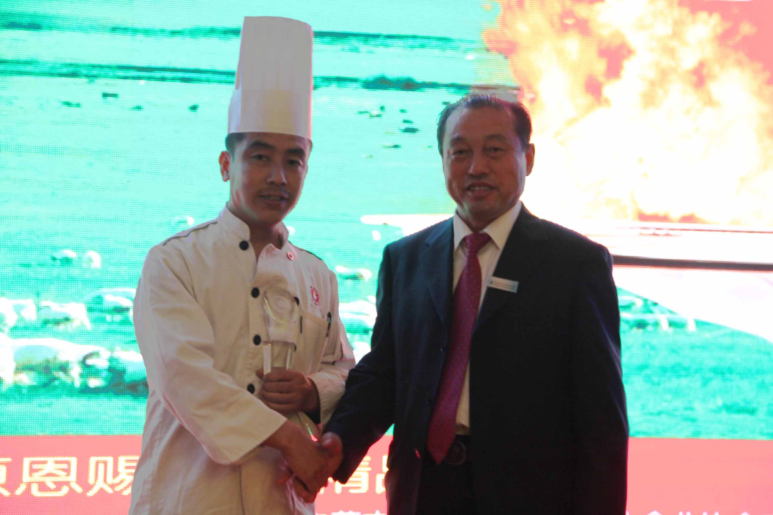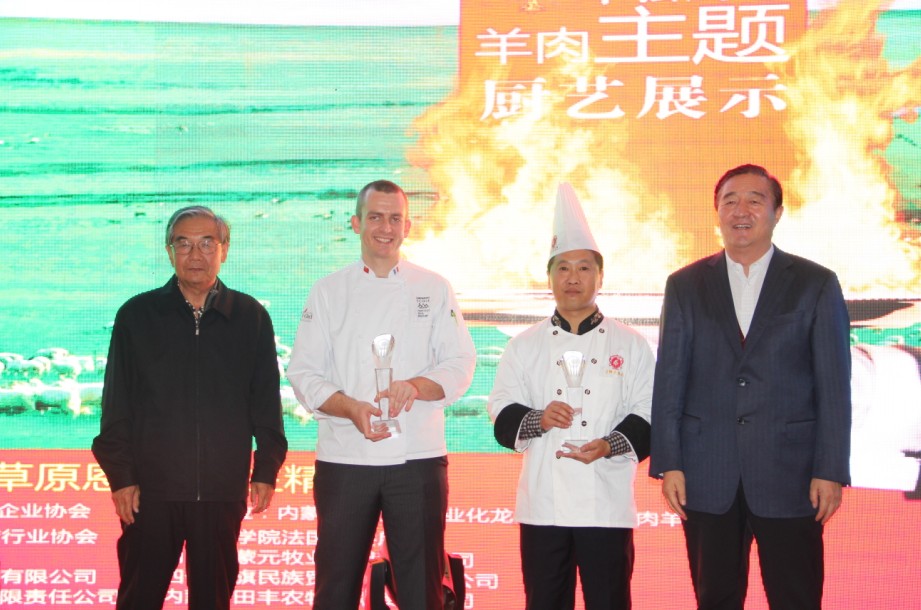 本次廚藝比拼展示主要是中法兩國廚師之間的高手對決。兩國大廚根據(jù)羊肉的不同部位烹飪出各道菜品。本次比拼的標(biāo)準(zhǔn)主要是養(yǎng)生、創(chuàng)意和具有地域特色。各評委經(jīng)過仔細(xì)品嘗后評選出特等獎、一等獎各一名。最終由遠(yuǎn)道而來的法國大廚獲得特等獎,我們中國廚師隊獲得一等獎。原副主任雷·額爾德尼和原副主席傅守正為獲獎選手頒發(fā)獎杯。