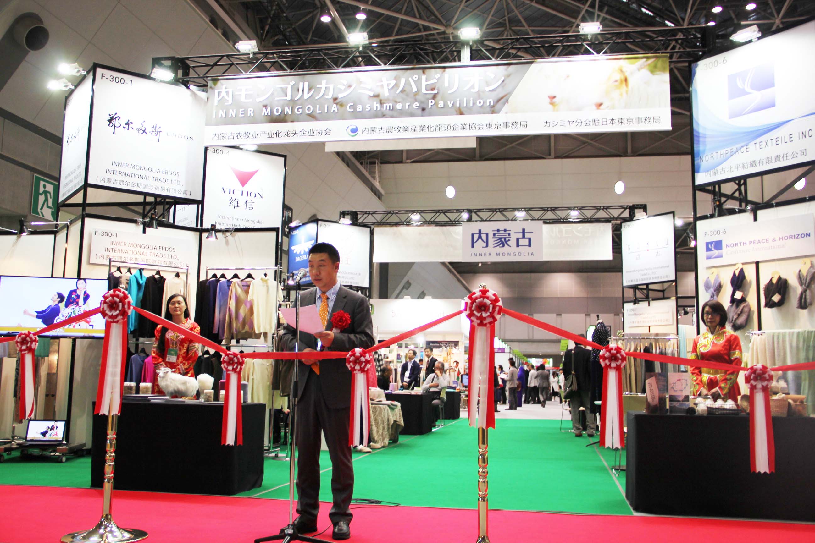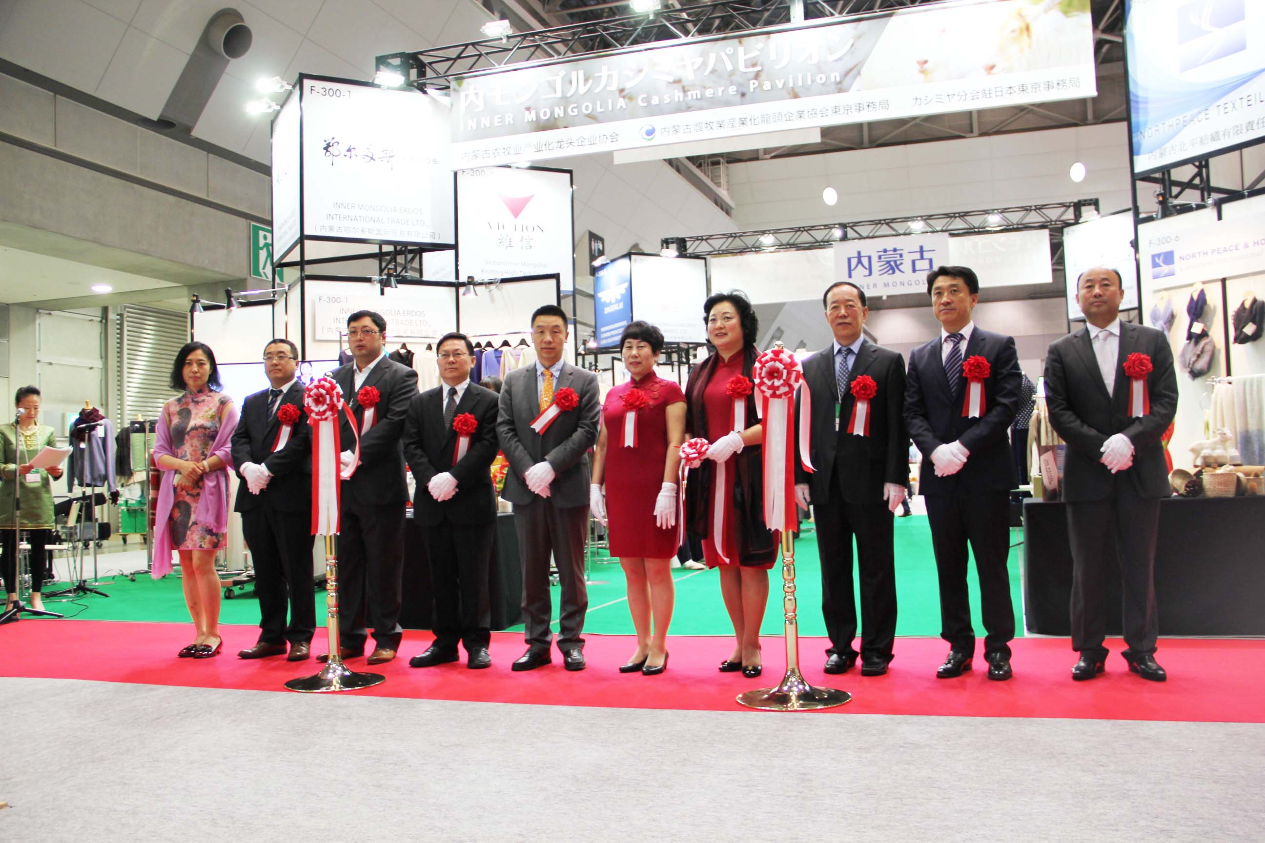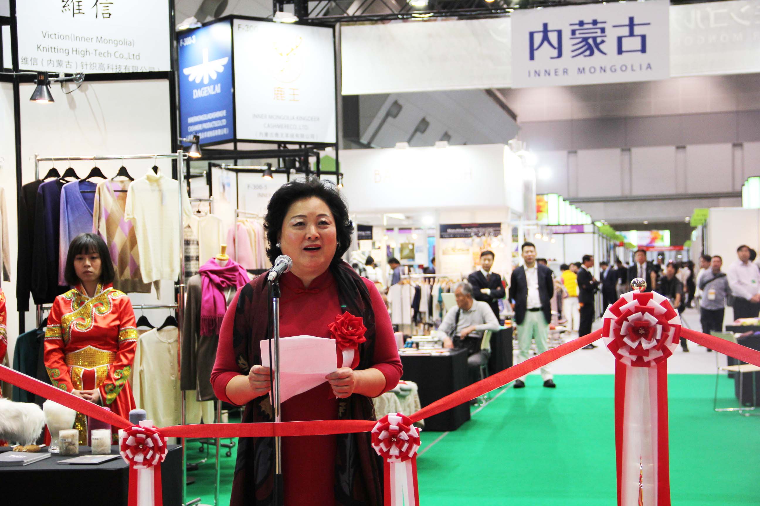 2016426日上午11時(shí),在內(nèi)蒙古羊絨展區(qū)前,舉行了盛大的開(kāi)業(yè)剪彩儀式,內(nèi)蒙古自治農(nóng)牧業(yè)廳產(chǎn)業(yè)化處副處長(zhǎng)郟金梅、內(nèi)蒙古農(nóng)牧產(chǎn)業(yè)化龍頭企業(yè)協(xié)會(huì)會(huì)長(zhǎng)閆樹(shù)春、內(nèi)蒙古農(nóng)牧產(chǎn)業(yè)化龍頭企業(yè)協(xié)會(huì)羊絨產(chǎn)業(yè)分會(huì)會(huì)長(zhǎng)王風(fēng)之出席剪彩儀式,并分別就政府支持、協(xié)會(huì)服務(wù)和企業(yè)自律發(fā)展等幾方面做了精彩致辭。郟金梅副處長(zhǎng)表示,希望通過(guò)此次活動(dòng),使得社會(huì)各界代表能夠贏得機(jī)遇、拓展空間,取得豐碩的成果,同時(shí)真誠(chéng)盼望各方來(lái)賓、新老朋友能夠進(jìn)一步了解內(nèi)蒙古羊絨,認(rèn)識(shí)內(nèi)蒙古羊絨,并以此為契機(jī),加強(qiáng)內(nèi)蒙古羊絨界與日本企業(yè)的合作,攜手發(fā)展,實(shí)現(xiàn)共贏,共創(chuàng)輝煌。閆樹(shù)春會(huì)長(zhǎng)在致辭中講到,我們此行不僅是要展示內(nèi)蒙古羊絨原料優(yōu)勢(shì)地位和行業(yè)加工的專業(yè)性,更希望能充分利用各個(gè)平臺(tái)廣泛交流,探討合作途徑的契合點(diǎn),推動(dòng)兩國(guó)羊絨行業(yè)多方共贏,共同提升全球市場(chǎng)對(duì)羊絨產(chǎn)品的認(rèn)知度,希望我們的羊絨企業(yè)能團(tuán)結(jié)一致,實(shí)現(xiàn)羊絨產(chǎn)業(yè)的可持續(xù)發(fā)展。羊絨產(chǎn)業(yè)分會(huì)會(huì)長(zhǎng)王風(fēng)之在致辭中表示,通過(guò)內(nèi)蒙古農(nóng)牧業(yè)產(chǎn)業(yè)化龍頭企業(yè)協(xié)會(huì)羊絨分會(huì)的平臺(tái),我們勢(shì)必會(huì)在培育超細(xì)超長(zhǎng)型產(chǎn)絨山羊、提升優(yōu)質(zhì)種群的規(guī)模、建立行業(yè)質(zhì)量標(biāo)準(zhǔn)和抱團(tuán)發(fā)展,積極進(jìn)行海外市場(chǎng)渠道、品牌、投資等多方面取得突破性進(jìn)展,致力于將中國(guó)內(nèi)蒙古羊絨打造成為全球性的產(chǎn)業(yè)品牌。
