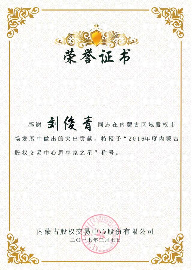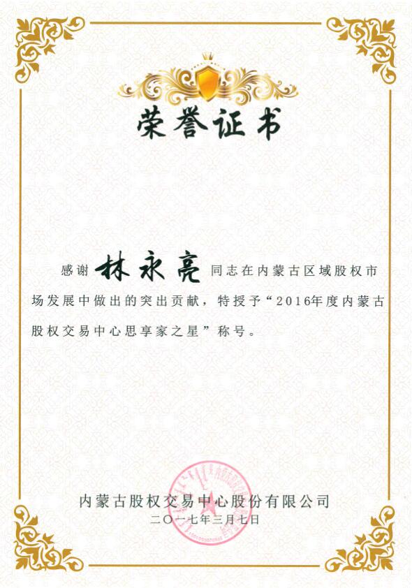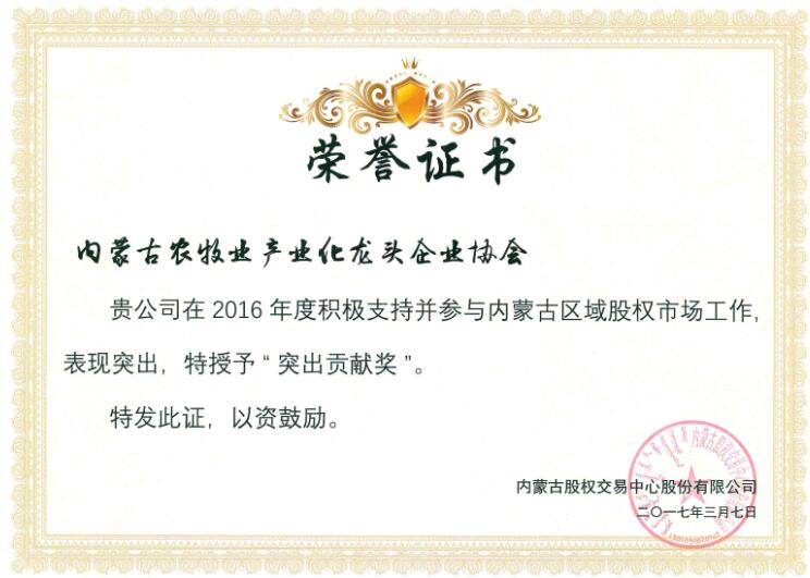 在37日上午召開的首屆內(nèi)蒙古股權(quán)交易中心會員和分支機構(gòu)大會上,內(nèi)蒙古農(nóng)牧業(yè)產(chǎn)業(yè)化龍頭企業(yè)協(xié)會因積極支持并參與內(nèi)蒙古區(qū)域股權(quán)市場工作,榮獲內(nèi)蒙古股權(quán)交易中心頒發(fā)的“突出貢獻獎”,協(xié)會執(zhí)行會長兼秘書長林永亮及常務(wù)秘書長劉俊青均榮獲“內(nèi)蒙古股權(quán)交易中心思享家之星”稱號。這是對協(xié)會在2016年對內(nèi)蒙古區(qū)域股權(quán)市場發(fā)展中突出貢獻的肯定,更是承載著一份責任和希望,新的一年,內(nèi)蒙古農(nóng)牧業(yè)產(chǎn)業(yè)化龍頭企業(yè)協(xié)會將繼續(xù)秉承“溝通 服務(wù) 自律 發(fā)展”的服務(wù)宗旨,乘勢而上,加壓奮進,開拓創(chuàng)新,找準協(xié)會工作與股權(quán)經(jīng)濟建設(shè)的結(jié)合點,為推動農(nóng)牧業(yè)產(chǎn)業(yè)化發(fā)展做出新的貢獻。