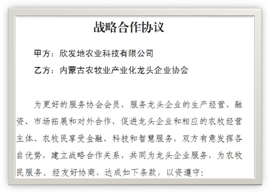 經(jīng)友好協(xié)商,林永亮執(zhí)行會長和苗自然董事長分別代表內(nèi)蒙古農(nóng)牧業(yè)產(chǎn)業(yè)化龍頭企業(yè)協(xié)會和欣發(fā)地農(nóng)業(yè)科技有限公司,就融資融智、智慧農(nóng)業(yè)、平臺建設(shè)等項目簽訂了戰(zhàn)略合作協(xié)議,共同為龍頭企業(yè)服務(wù),為農(nóng)牧民服務(wù)。