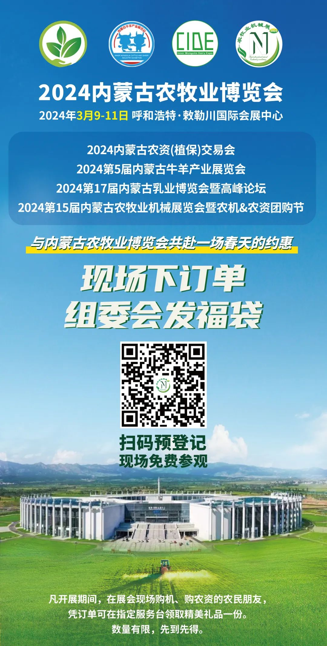 歡迎參會(huì)!更多展會(huì)資訊、請(qǐng)關(guān)注微信公眾號(hào):內(nèi)蒙古農(nóng)機(jī)展。進(jìn)入展會(huì)須注冊(cè)登記方可入場(chǎng),煩請(qǐng)?jiān)诠娞?hào)菜單欄"參觀指南"-“參觀展會(huì)”按鈕點(diǎn)擊,隨后填寫(xiě)信息進(jìn)行注冊(cè),憑注冊(cè)成功的二維碼即可入場(chǎng)參觀?;驋呙枰韵露S碼,進(jìn)行預(yù)登記。