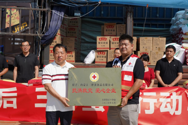 風(fēng)雨突襲巴彥淖爾時,內(nèi)蒙古農(nóng)牧業(yè)產(chǎn)業(yè)化龍頭企業(yè)協(xié)會會長單位巴彥淖爾市三胖蛋食品有限公司與家鄉(xiāng)共赴暖陽,8月1日,三胖蛋公司開展“一戶不落”精準(zhǔn)捐贈活動,為套海鎮(zhèn)和平村436戶受災(zāi)村民送去價值15萬元的米、面、油等生活物資。這個從河套平原走向全國的品牌,用行動詮釋著”家鄉(xiāng)人永遠(yuǎn)和家鄉(xiāng)人站在一起“的質(zhì)樸承諾。