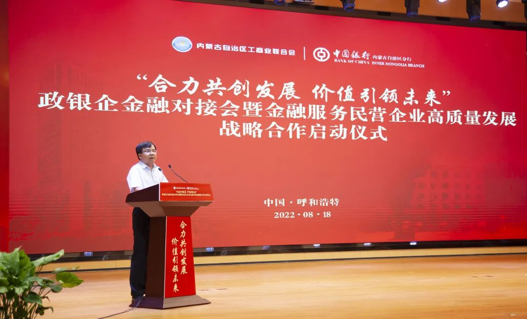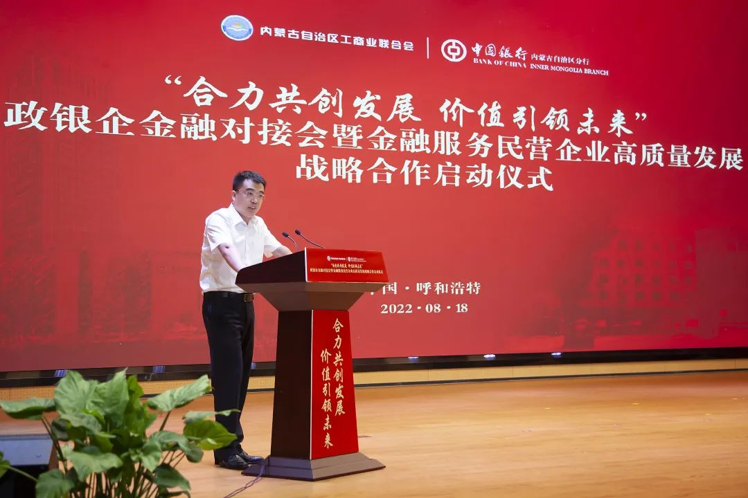 胡文勇行長在開場致辭中表示,一直以來,自治區(qū)工商聯(lián)充分發(fā)揮統(tǒng)戰(zhàn)性、經(jīng)濟性、民間性綜合優(yōu)勢,團結和帶領廣大非公有制經(jīng)濟人士,與時俱進,大膽創(chuàng)新,努力實踐,推動優(yōu)化營商環(huán)境,促進我區(qū)非公有制經(jīng)濟又好又快發(fā)展,為全面建設小康社會、構建和諧社會作出重要貢獻。作為唯一一家持續(xù)經(jīng)營超過百年的國有大行,中國銀行秉承“融通世界、造福社會”的崇高使命,將自身發(fā)展與地方經(jīng)濟發(fā)展緊密相連,主動擔當服務支持民營企業(yè)發(fā)展壯大的金融重任。未來,中國銀行內蒙古區(qū)分行將繼續(xù)深耕細作民營經(jīng)濟領域的融資服務,在普惠金融、科技金融、綠色金融等領域加強金融支持,緩解小微企業(yè)“融資難、融資貴”問題,助企紓困,風雨同舟,為深化政銀企合作共贏發(fā)展貢獻新力量!