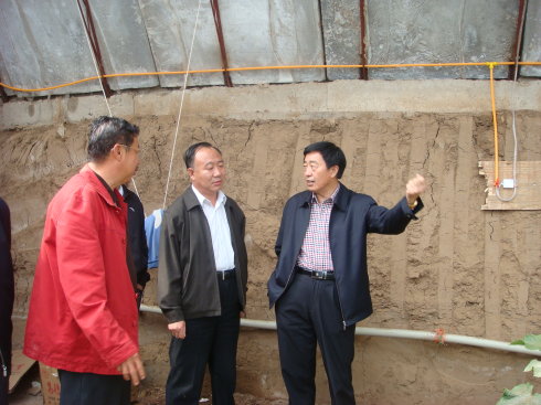 呼市政府高副市長(zhǎng)(右一)、畢克齊鎮(zhèn)黨委(中)姜書記在基地越冬暖棚內(nèi)