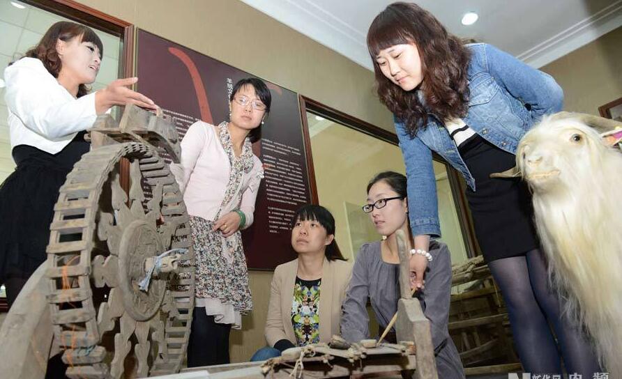 講解員在羊絨歷史文化博物館向游客介紹古老的英國圓輪紡車。(5月3日攝)