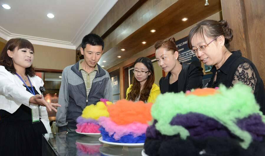 講解員在羊絨歷史文化博物館向游客介紹羊絨種類(5月3日攝)