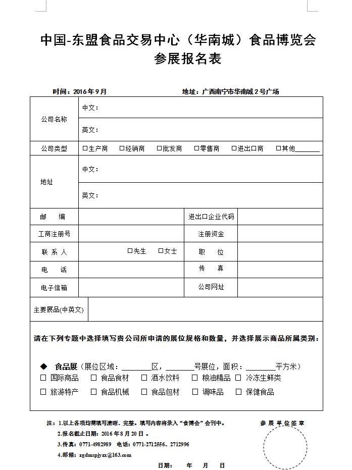 附件4.中國(guó)-東盟食品交易中心(華南城)食品博覽會(huì)報(bào)名表