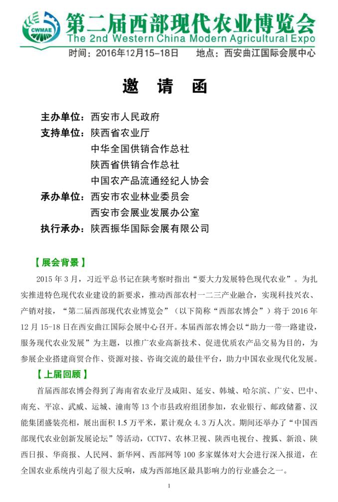 關(guān)于參加第二屆西部現(xiàn)代農(nóng)業(yè)博覽會的邀請函