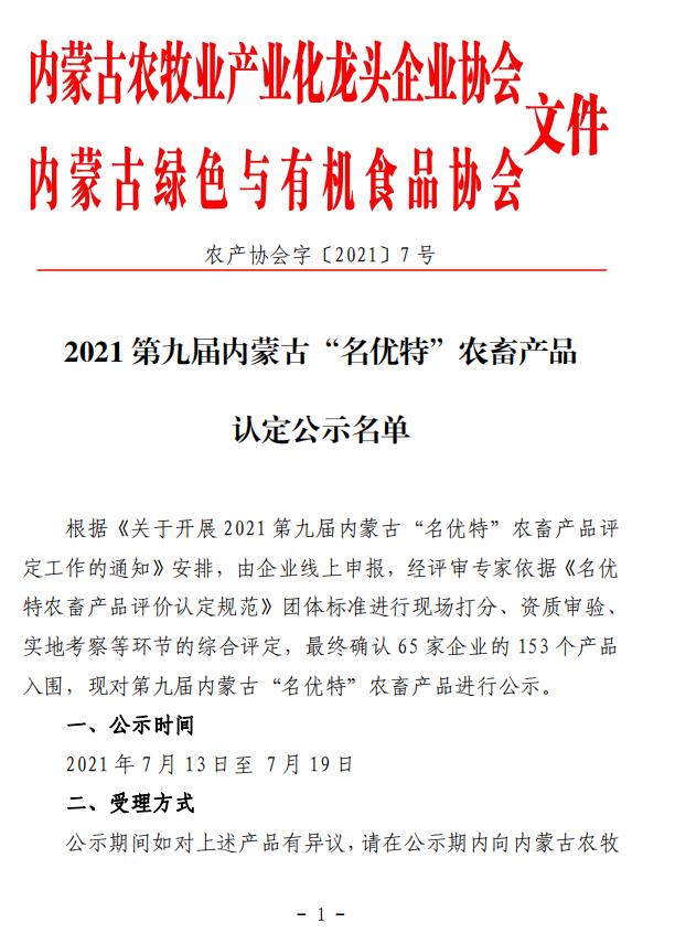 2021第九屆內(nèi)蒙古“名優(yōu)特”農(nóng)畜產(chǎn)品認(rèn)定公示名單