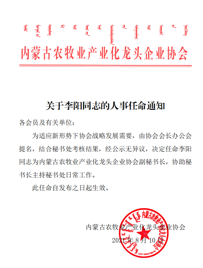 關(guān)于李陽(yáng)同志的人事任命通知