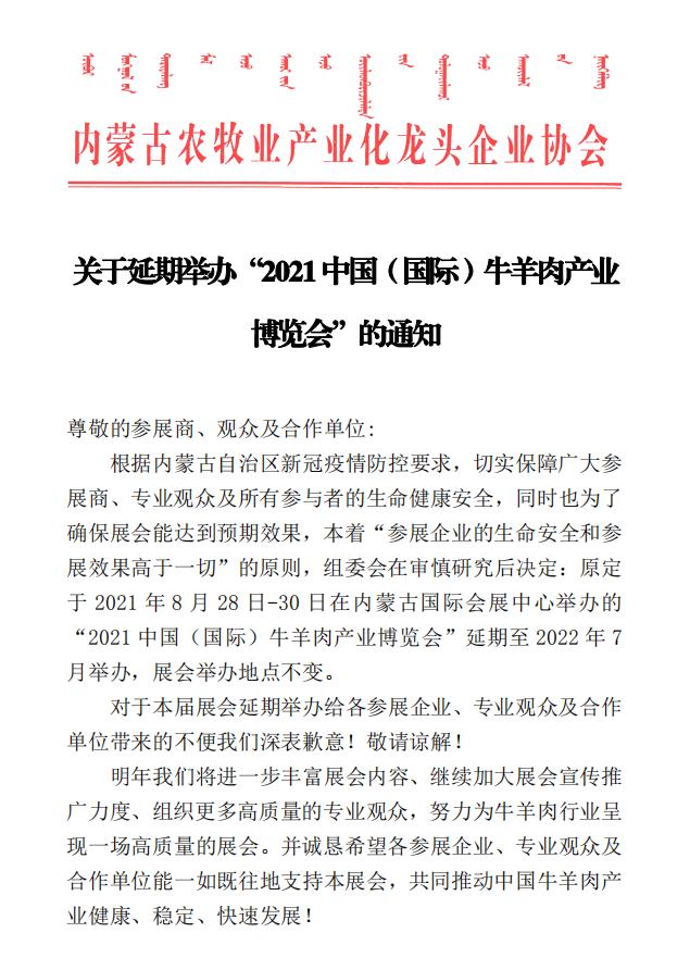關(guān)于延期舉辦“2021中國(國際)牛羊肉產(chǎn)業(yè)博覽會(huì)”的通知