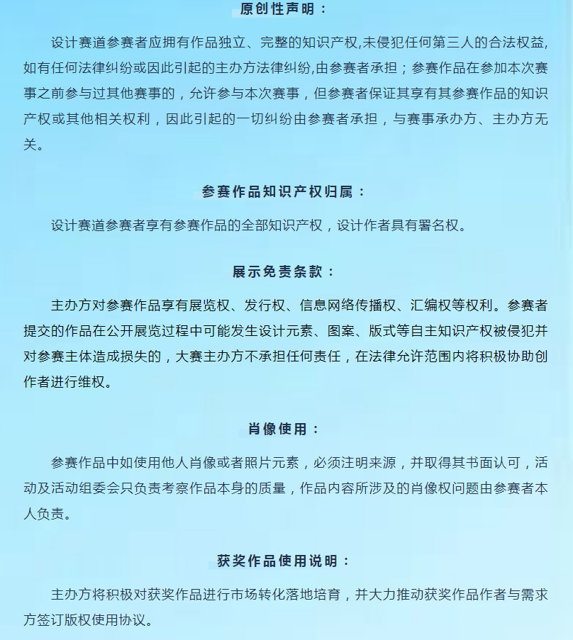 設(shè)計(jì)賽道作品獎(jiǎng)金不包含作品版權(quán),版權(quán)購買形式及費(fèi)用由需求單位與獲獎(jiǎng)作者自行協(xié)商確定。