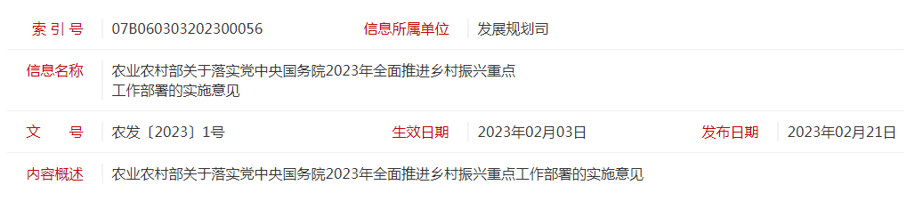 標(biāo)題:農(nóng)發(fā)〔2023〕1號(hào)農(nóng)業(yè)農(nóng)村部關(guān)于落實(shí)黨中央國(guó)務(wù)院2023年全面推進(jìn)鄉(xiāng)村振興重點(diǎn)工作部署的實(shí)施意見(jiàn)