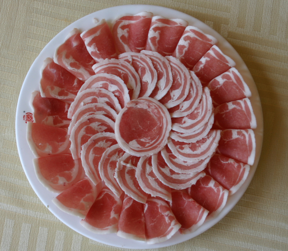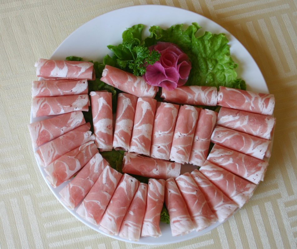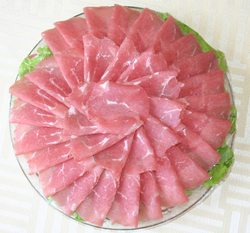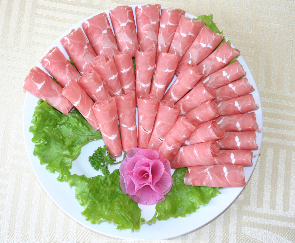 七、   杜泊羊肉卷:選用原料:采用南非引進的杜伯羊,經(jīng)過雜交改良的品種。肉中脂肪分布均勻,胴體品質(zhì)高。經(jīng)選修之后,全部按照肥瘦搭配制成羊肉卷。一涮即熟、就涮不老。
