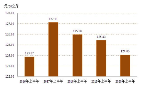 1.小麥:1、2月份春節(jié)假期疊加新冠肺炎疫情,糧企停工停產(chǎn),市場交易趨于平淡,小麥收購價格整體穩(wěn)定。3月份之后,隨著新冠肺炎疫情得到有效控制,各地復工復產(chǎn)復學的大范圍推進,截止12月份全區(qū)小麥每50公斤平均收購價格為124.06元,同比下降1.09%,詳見圖3(來源:內(nèi)蒙古自治區(qū)發(fā)展和改革委員會)
