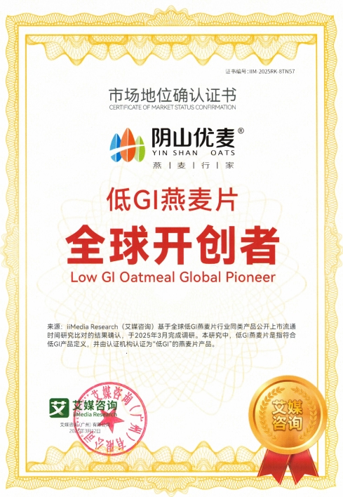 陰山優(yōu)麥此次發(fā)布的新品低GI燕麥片,是其深耕健康食品領域的又一力作。新品不僅通過專業(yè)機構檢測認證,獲得“低GI食品認證”,同時陰山優(yōu)麥還獲得了“低GI燕麥片全球開創(chuàng)者”市場地位確認證書。