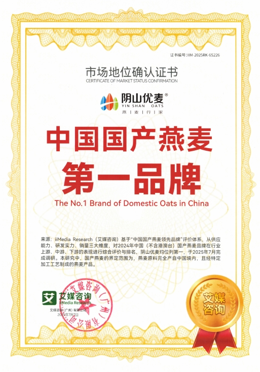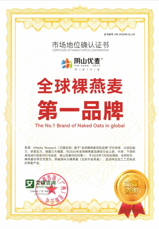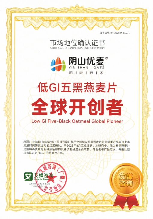 2025年7月,內(nèi)蒙古陰山優(yōu)麥?zhǔn)称酚邢薰精@得權(quán)威咨詢機(jī)構(gòu)艾媒咨詢(iiMedia Research)頒發(fā)的“全球裸燕麥第一品牌”與“中國國產(chǎn)燕麥第一品牌”市場地位確認(rèn)證書。同時(shí),其創(chuàng)新產(chǎn)品“低GI五黑燕麥片”亦被權(quán)威認(rèn)證為全球開創(chuàng)者,標(biāo)志著陰山優(yōu)麥在全球燕麥行業(yè)取得突破性成果。